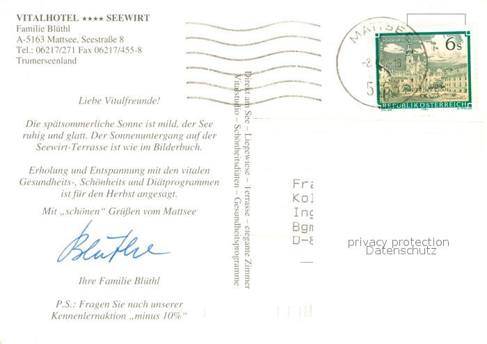 73360643 alte Postkarte Mattsee Salzburg Vitalhotel Seewirt Wellness postalisch gelaufen Erhaltung siehe scans [FriedD77] KatCode: 11390323050323