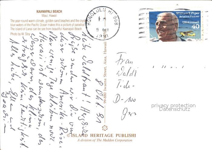 72597327 old postcard Maui Hawaii Kaanapali Beach Segelboot postalisch gelaufen Erhaltung siehe scans [FriedD77] KatCode: 14140130000000