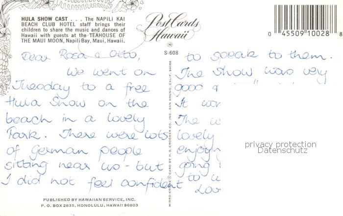 73848329 Maui Hawaii USA Hula Show Cast The Napili Kai Beach Club Hotel postalisch nicht gelaufen Erhaltung siehe scans [WerneD78] KatCode: 14140130000000
