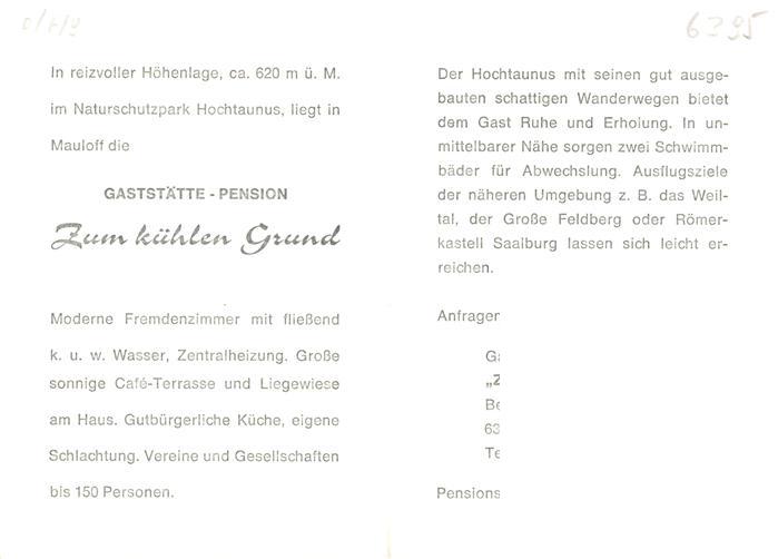 73869976 Mauloff Weilrod Gaststaette Pension Zum kuehlen Grund Gaststube Terrasse Panorama postalisch nicht gelaufen Werbekarte (keine Postkarte) Erhaltung siehe scans [FriedD77] KatCode: 11110006434013