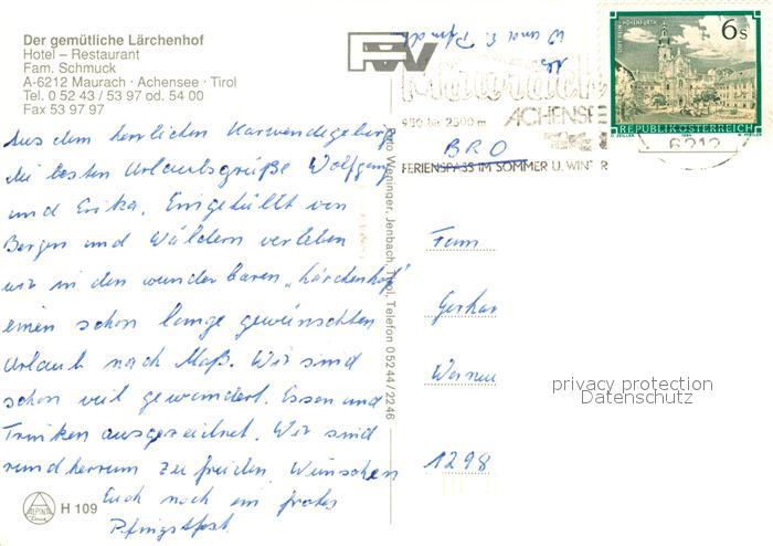 73280549 alte Postkarte Maurach Achensee Gasthof Restaurant Laerchenhof postalisch gelaufen Erhaltung siehe scans [WerneD78] KatCode: 11390335070907