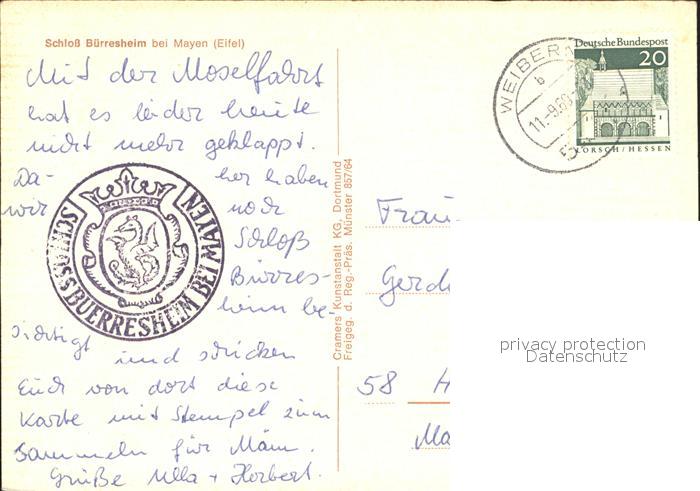 72204169 alte Postkarte Mayen Fliegeraufnahme Schloss Buerresheim postalisch gelaufen Erhaltung siehe scans KatCode: 11110007137068