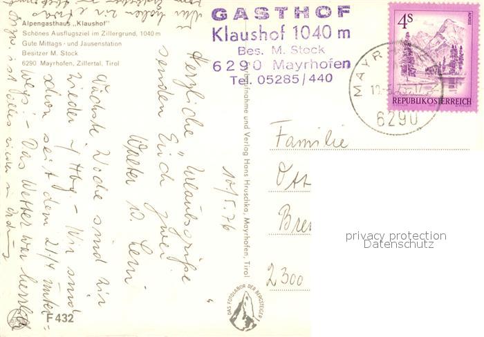 73523786 alte Postkarte Mayrhofen Zillertal Alpengasthaus Klaushof postalisch gelaufen Erhaltung siehe scans [LiesaD40] KatCode: 11390335070920