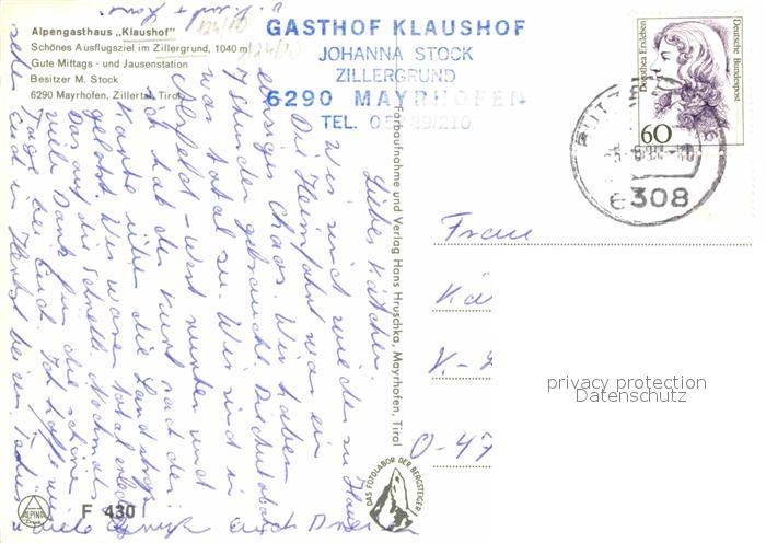 12636543 alte Postkarte Mayrhofen Zillertal Alpengasthaus Klaushof postalisch gelaufen Erhaltung siehe scans [LiesaD40] KatCode: 11390335070920