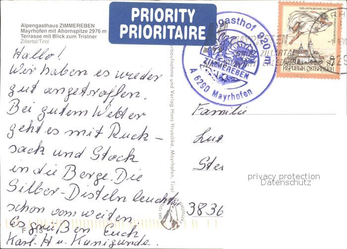 72283565 alte Postkarte Mayrhofen Zillertal Alpengasthaus Zimmereben Terrasse Ahornspitze Tristner Zillertaler Alpen postalisch gelaufen Erhaltung siehe scans KatCode: 11390335070920