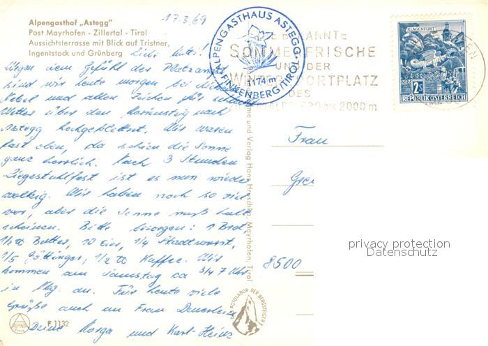 73267202 alte Postkarte Mayrhofen Zillertal Alpengasthof Astegg postalisch gelaufen Erhaltung siehe scans [KathaD81] KatCode: 11390335070920
