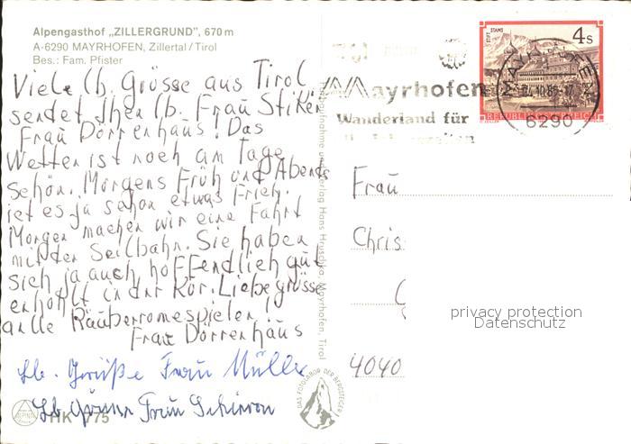 12313336 alte Postkarte Mayrhofen Zillertal Alpengasthof Zillergrund postalisch gelaufen Erhaltung siehe scans KatCode: 11390335070920