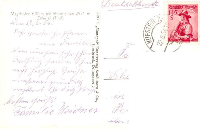 alte Postkarte Mayrhofen Zillertal AT mit Ahornspitze postalisch gelaufen Erhaltung siehe scans [WerneD78]