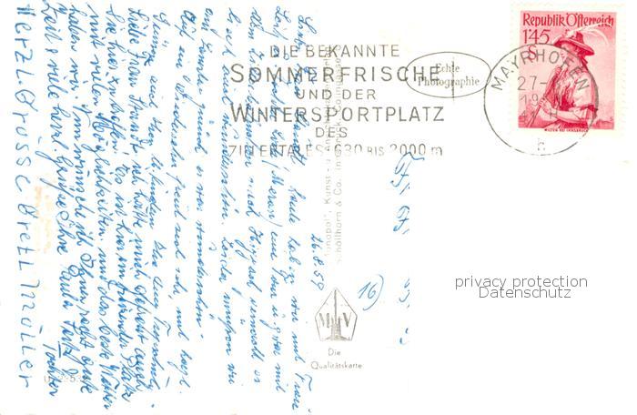 73786279 alte Postkarte Mayrhofen Zillertal AT Orts und Teilansichten Wasserfall Kirche postalisch gelaufen Erhaltung siehe scans [WerneD78] KatCode: 11390335070920