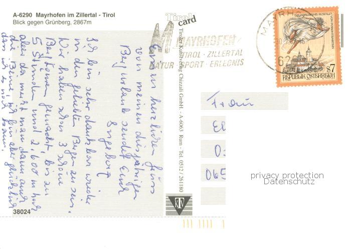 73760008 alte Postkarte Mayrhofen Zillertal Fliegeraufnahme mit Gruenberg postalisch gelaufen Erhaltung siehe scans [WerneD78] KatCode: 11390335070920