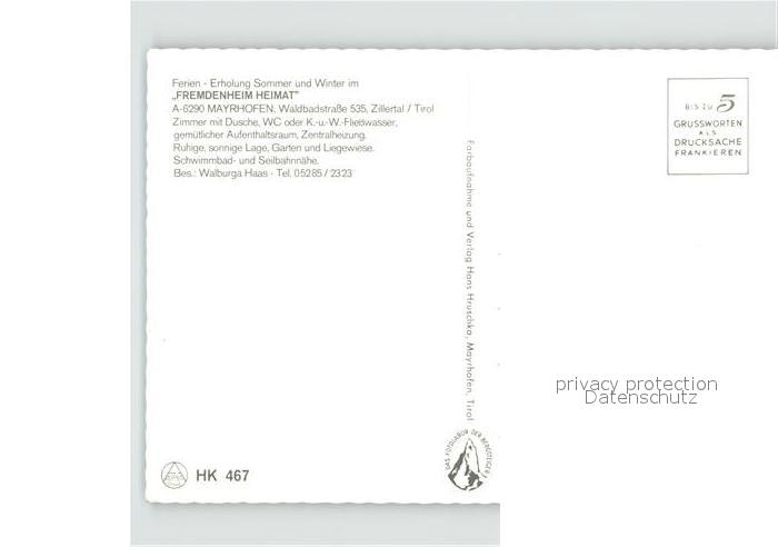 71835106 Mayrhofen Zillertal Fremdenheim Heimat Pension postalisch nicht gelaufen Erhaltung siehe scans KatCode: 11390335070920