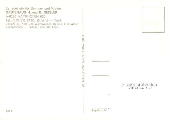 73588131 Mayrhofen Zillertal Gaestehaus Geisler postalisch nicht gelaufen Erhaltung siehe scans [FriedD77] KatCode: 11390335070920