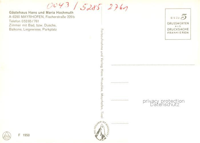 73588139 Mayrhofen Zillertal Gaestehaus Hochmuth Zillertaler Alpen postalisch nicht gelaufen Erhaltung siehe scans [FriedD77] KatCode: 11390335070920