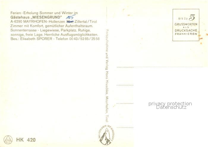 73085804 Mayrhofen Zillertal Gaestehaus Wiesengrund postalisch nicht gelaufen Erhaltung siehe scans [FriedD77] KatCode: 11390335070920