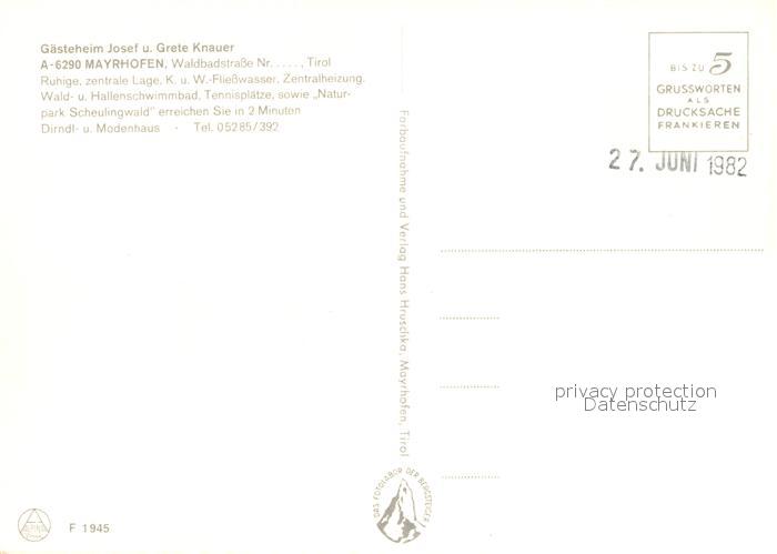 73373242 Mayrhofen Zillertal Gaesteheim Knauer Dirndl- und Modenhaus Alpen postalisch nicht gelaufen Erhaltung siehe scans [FriedD77] KatCode: 11390335070920
