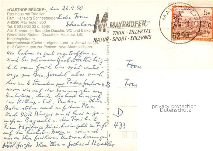 73591050 alte Postkarte Mayrhofen Zillertal Gasthaus Bruecke Winteraufnahme postalisch gelaufen Erhaltung siehe scans [KathaD81] KatCode: 11390335070920