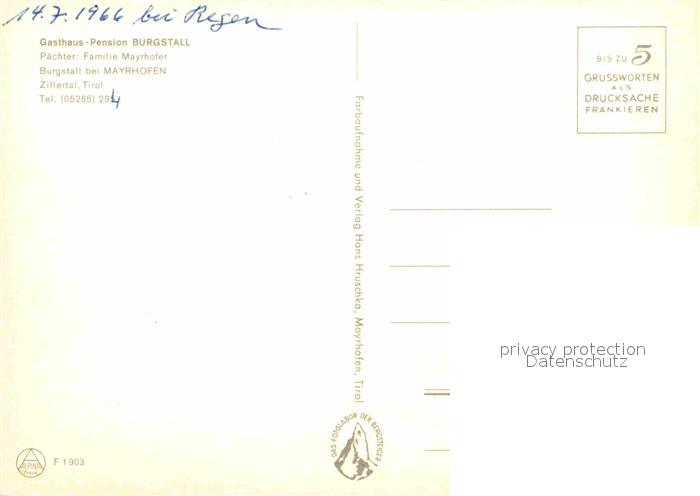 72832100 Mayrhofen Zillertal Gasthaus Pension Burgstall postalisch nicht gelaufen Erhaltung siehe scans [LiesaD40] KatCode: 11390335070920
