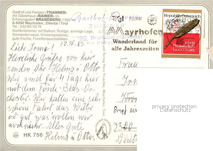 73523785 alte Postkarte Mayrhofen Zillertal Gasthaus Pension Thanner G?stehaus-Rainer Brandberg postalisch gelaufen Erhaltung siehe scans [LiesaD40] KatCode: 11390335070920