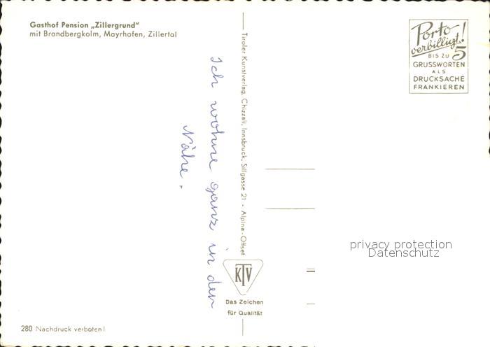 72592581 Mayrhofen Zillertal Gasthof Pension Zillergrund mit Brandbergkolm Zillertaler Alpen postalisch nicht gelaufen Erhaltung siehe scans [FriedD77] KatCode: 11390335070920