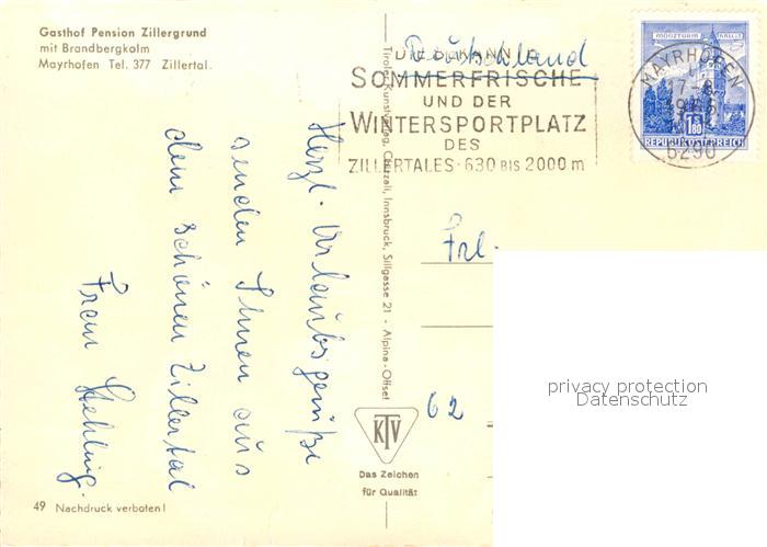 73043588 alte Postkarte Mayrhofen Zillertal Gasthof Pension Zillergrund mit Brandbergkolm Zillertaler Alpen postalisch gelaufen Erhaltung siehe scans [FriedD77] KatCode: 11390335070920
