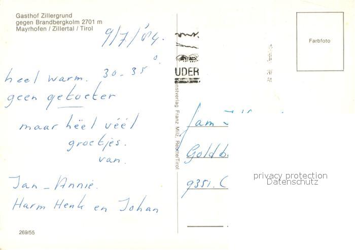 73033339 alte Postkarte Mayrhofen Zillertal Gasthof Zillergrund Brandbergkolm postalisch gelaufen Erhaltung siehe scans [PaolaD17] KatCode: 11390335070920