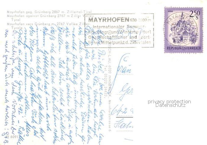 73000888 alte Postkarte Mayrhofen Zillertal Gesamtansicht Gruenberg postalisch gelaufen Erhaltung siehe scans [AndreD76] KatCode: 11390335070920
