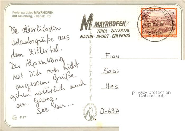 73163306 alte Postkarte Mayrhofen Zillertal Gruenberg postalisch gelaufen Erhaltung siehe scans [NatalD47] KatCode: 11390335070920