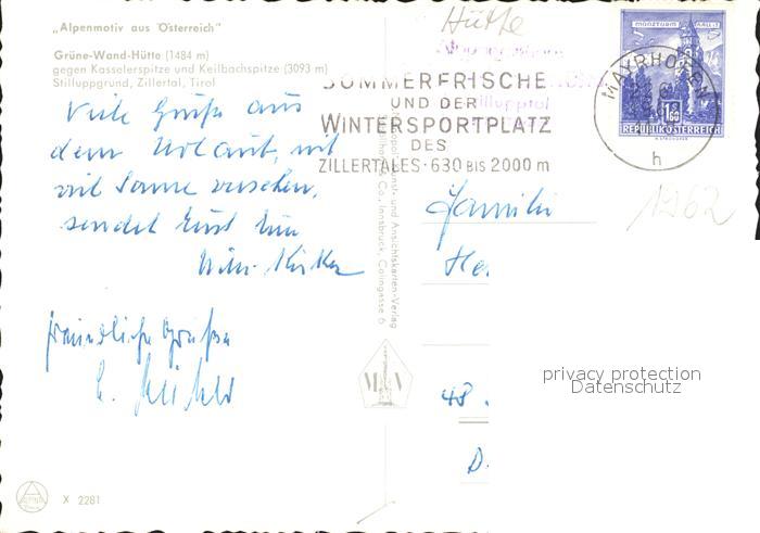 72007566 alte Postkarte Mayrhofen Zillertal gruene Wand Huette mit Kassler und Keilbachspitze postalisch gelaufen KatCode: 11390335070920