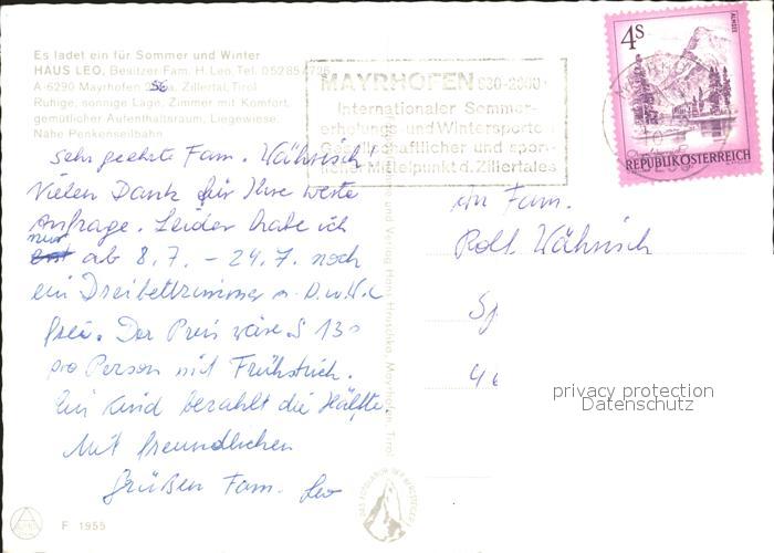 72240329 alte Postkarte Mayrhofen Zillertal Haus Leo Pension Alpen postalisch gelaufen Erhaltung siehe scans KatCode: 11390335070920