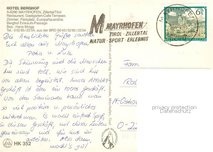 13036220 alte Postkarte Mayrhofen Zillertal Hotel Berghof postalisch gelaufen Erhaltung siehe scans [WerneD78] KatCode: 11390335070920
