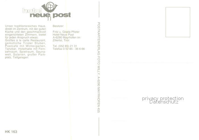73363364 Mayrhofen Zillertal Hotel Neue Post Blumen postalisch nicht gelaufen Erhaltung siehe scans [FriedD77] KatCode: 11390335070920