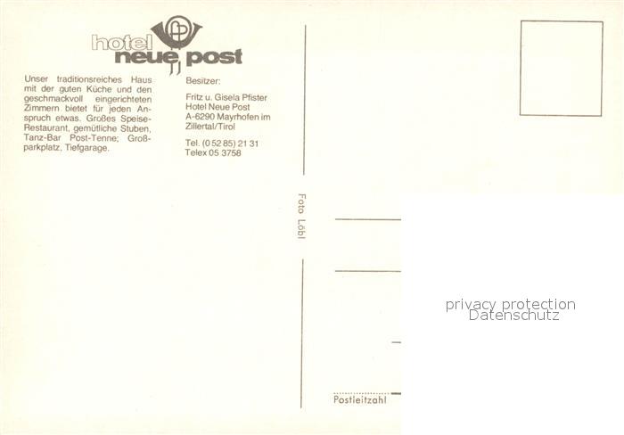 73356543 Mayrhofen Zillertal Hotel Neue Post Restaurant postalisch nicht gelaufen Erhaltung siehe scans [FriedD77] KatCode: 11390335070920