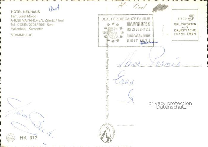71812468 alte Postkarte Mayrhofen Zillertal Hotel Neuhaus postalisch gelaufen Erhaltung siehe scans KatCode: 11390335070920