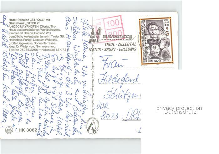 72038636 alte Postkarte Mayrhofen Zillertal Hotel Pension Strolz postalisch gelaufen Erhaltung siehe scans KatCode: 11390335070920