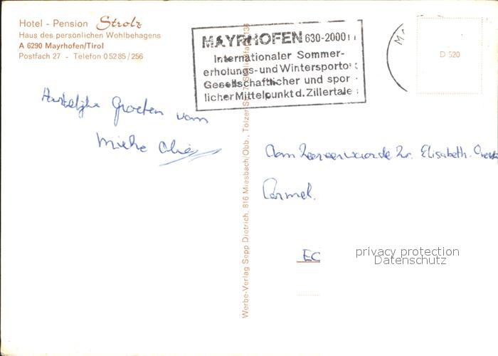 12379528 alte Postkarte Mayrhofen Zillertal Hotel Pension Strolz postalisch gelaufen Erhaltung siehe scans KatCode: 11390335070920