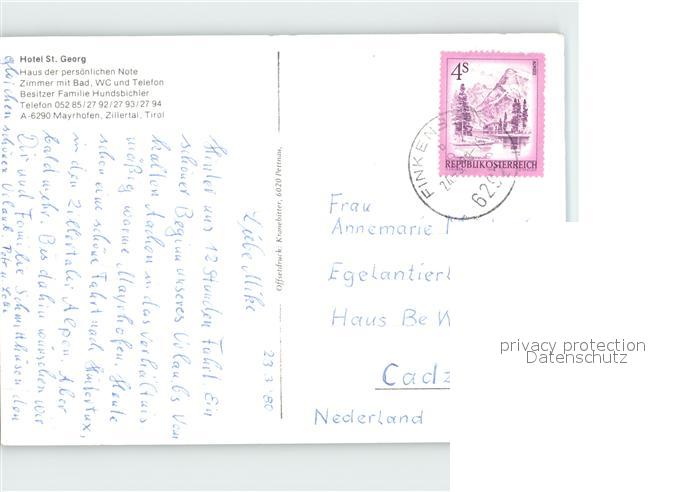 72080938 alte Postkarte Mayrhofen Zillertal Hotel St Georg postalisch gelaufen Erhaltung siehe scans KatCode: 11390335070920