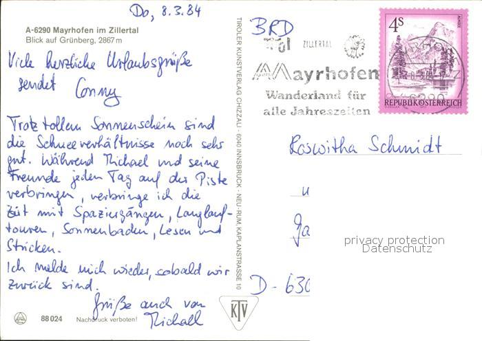 72454750 alte Postkarte Mayrhofen Zillertal mit Gruenberg postalisch gelaufen Erhaltung siehe scans KatCode: 11390335070920