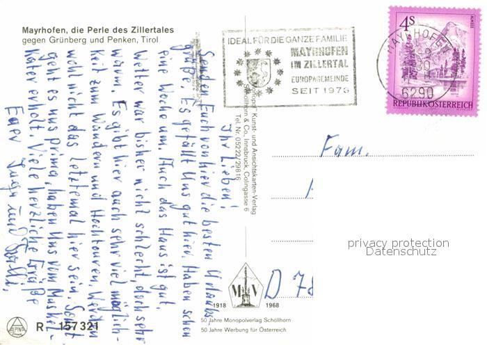 42622196 alte Postkarte Mayrhofen Zillertal mit Gruenberg und Penken postalisch gelaufen Erhaltung siehe scans [WerneD78] KatCode: 11390335070920