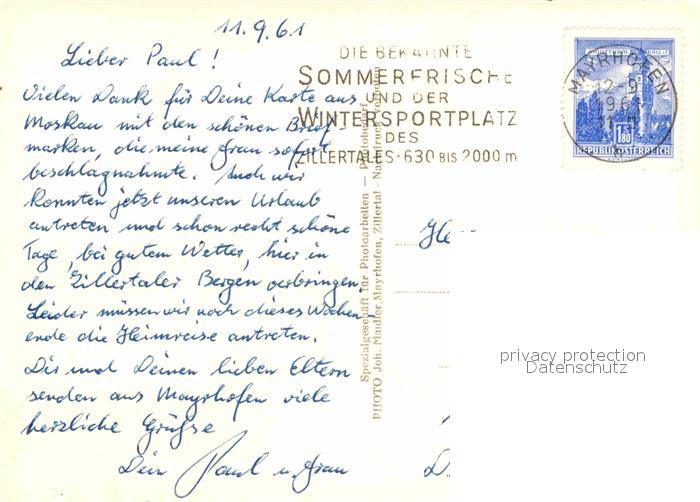 72755222 alte Postkarte Mayrhofen Zillertal Ortspartie an der Kirche Brunnen Kinder Trachten Alpenpanorama postalisch gelaufen Erhaltung siehe scans [FriedD77] KatCode: 11390335070920