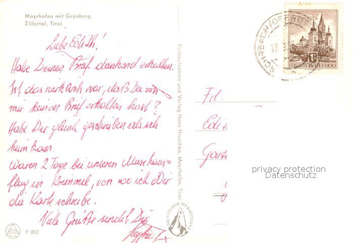 73577006 alte Postkarte Mayrhofen Zillertal Panorama Zillertal mit Blick zum Gruenberg Zillertaler Alpen postalisch gelaufen Erhaltung siehe scans [FriedD77] KatCode: 11390335070920