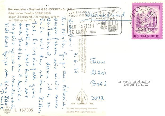 73513496 alte Postkarte Mayrhofen Zillertal Penkenbahn Gasthof Gschoesswand postalisch gelaufen Erhaltung siehe scans [KathaD81] KatCode: 11390335070920