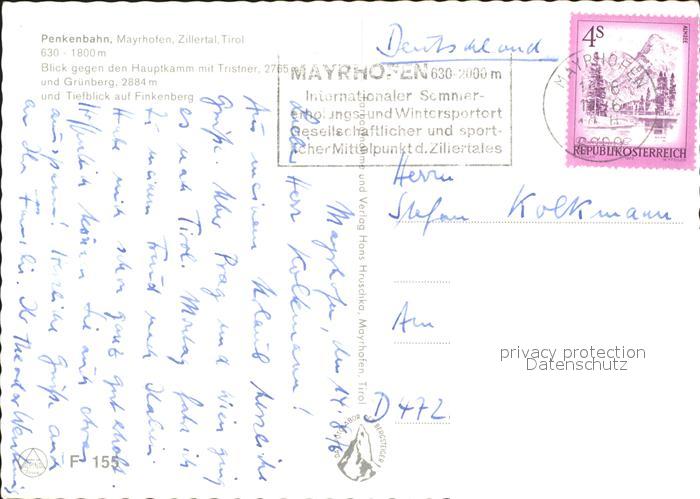 71951042 alte Postkarte Mayrhofen Zillertal Penkenbahn Hauptkamm Tristner Gruenberg Finkenberg postalisch gelaufen Erhaltung siehe scans KatCode: 11390335070920