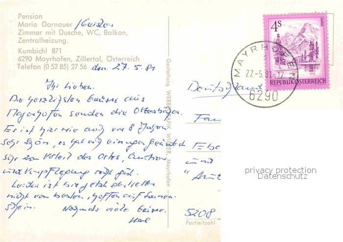 72791240 alte Postkarte Mayrhofen Zillertal Pension Maria Dornauer postalisch gelaufen Erhaltung siehe scans [LiesaD40] KatCode: 11390335070920