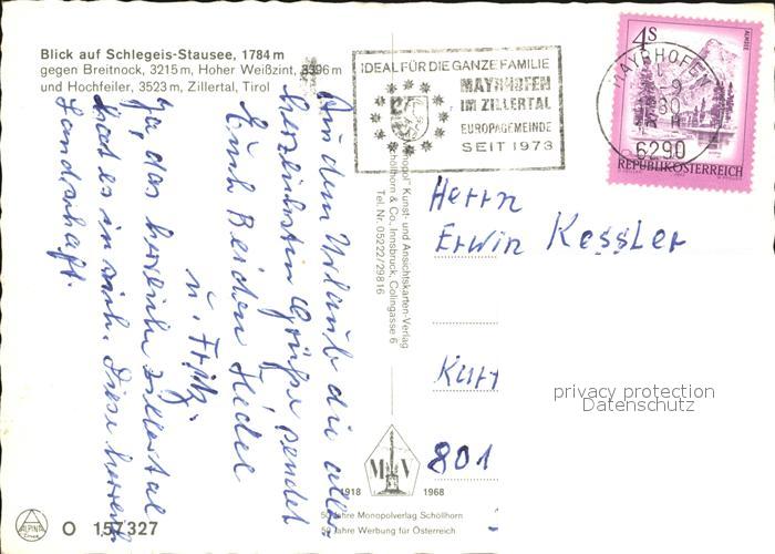72412041 alte Postkarte Mayrhofen Zillertal Schlegeis-Stausee Breitnock Hochfeiler postalisch gelaufen Erhaltung siehe scans KatCode: 11390335070920