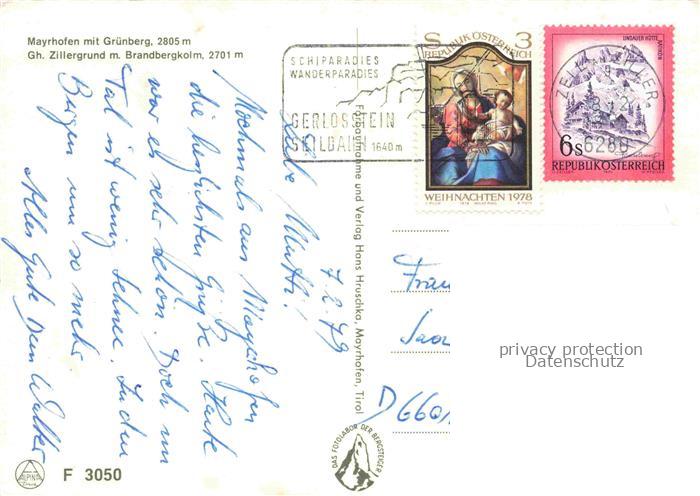 74042444 alte Postkarte Mayrhofen Zillertal Tirol AT mit Gruenberg Zillergrund und Brandbergkolm postalisch gelaufen Erhaltung siehe scans [WerneD78] KatCode: 11390335070920