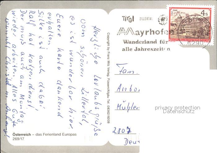 72371074 alte Postkarte Mayrhofen Zillertal Waldbad Dorfpartie Penken Seilbahn postalisch gelaufen Erhaltung siehe scans KatCode: 11390335070920