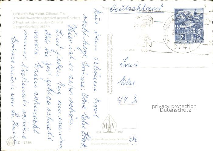 72446429 alte Postkarte Mayrhofen Zillertal Waldschwimmbad Trachtenkinder gegen Gruenberg postalisch gelaufen Erhaltung siehe scans KatCode: 11390335070920
