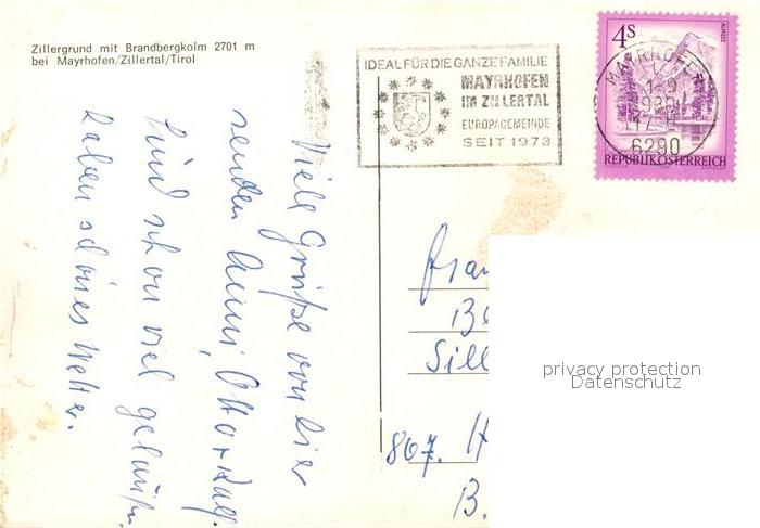 73049068 alte Postkarte Mayrhofen Zillertal Zillergrund Brandbergkolm postalisch gelaufen Erhaltung siehe scans [KathaD81] KatCode: 11390335070920