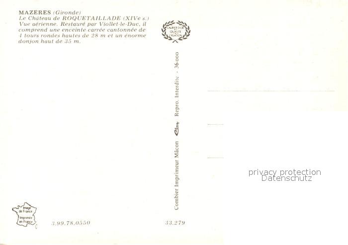 13318580 Mazeres Gironde Chateau de Roquetaillade XIV siècle vue aérienne postalisch nicht gelaufen Erhaltung siehe scans [FriedD77] KatCode: 11170033333279