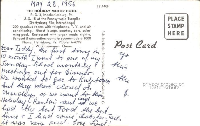72167265 old postcard Mechanicsburg Pennsylvania The Holiday Motor Hotel postalisch gelaufen Erhaltung siehe scans KatCode: 14140410000000